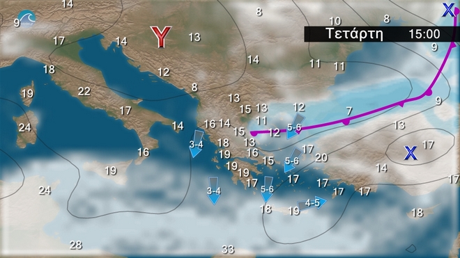 Στα νοτιοανατολικά νεφώσεις παροδικά αυξημένες με τοπικές βροχές, πιθανώς σποραδικές καταιγίδες και γρήγορη βελτίωση. Στα υπόλοιπα γενικά αίθριος καιρός με λίγες πρόσκαιρες νεφώσεις το πρωί στα νότια. Οι άνεμοι θα πνέουν από βόρειες διευθύνσεις στα δυτικά 4 με 6, στα ανατολικά 6 με 7 και στο νότιο Αιγαίο τοπικά 8 μποφόρ, με βαθμιαία εξασθένηση από το βράδυ. Η θερμοκρασία θα σημειώσει πτώση στα νότια.
