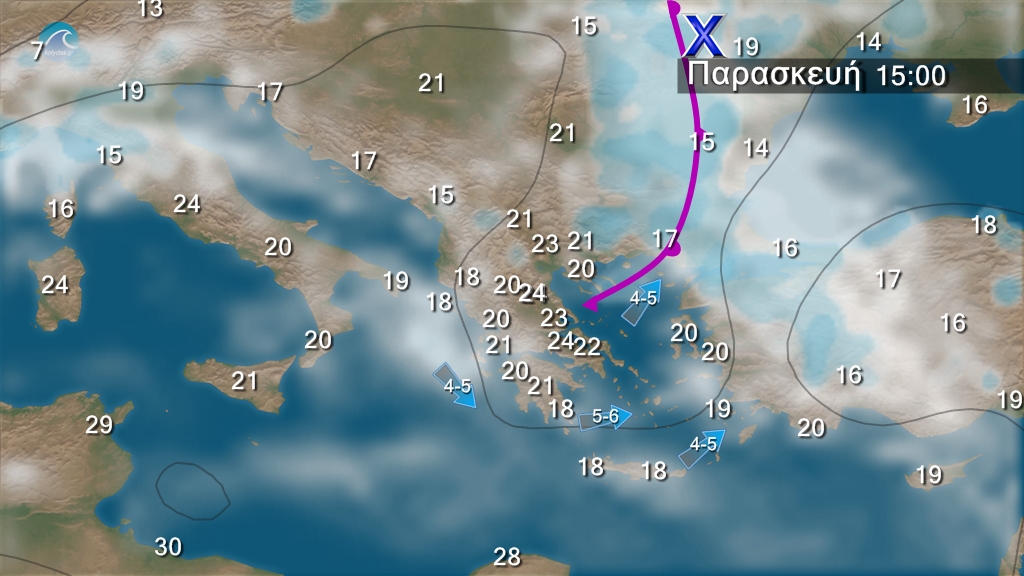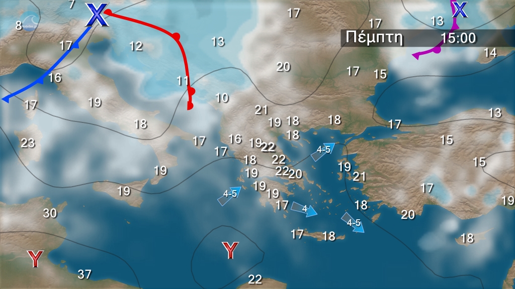 Στα βόρεια λίγες νεφώσεις κατά διαστήματα αυξημένες, με τοπικές βροχές και σποραδικές καταιγίδες κυρίως τις μεσημβρινές και απογευματινές ώρες, που το βράδυ θα περιοριστούν στα βορειοανατολικά. Στην υπόλοιπη χώρα αραιές νεφώσεις κατά διαστήματα πυκνότερες, με πιθανότητα τοπικών όμβρων τις μεσημβρινές και απογευματινές ώρες στα ηπειρωτικά ορεινά. Οι άνεμοι θα πνέουν από νότιες διευθύνσεις 3 με 5 και πρόσκαιρα στα πελάγη τοπικά 6 μποφόρ, με βαθμιαία εξασθένηση στα δυτικά. Η θερμοκρασία θα σημειώσει άνοδο.
