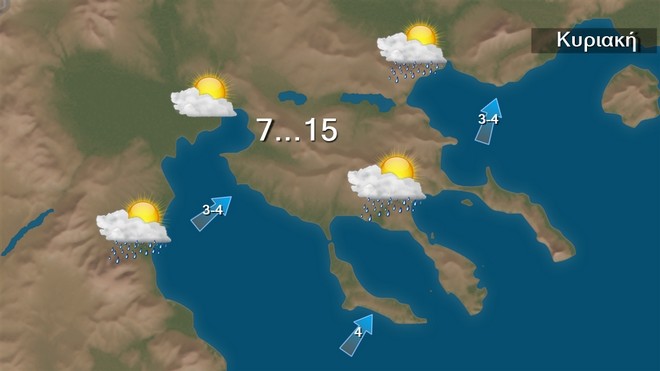 Την Κυριακή στα Δωδεκάνησα, την Κρήτη, τις Κυκλάδες και τα νησιά του ανατολικού Αιγαίου προβλέπονται τοπικές βροχές και στα Δωδεκάνησα σποραδικές καταιγίδες πιθανώς ισχυρές τις πρώτες πρωινές ώρες. Τα φαινόμενα γρήγορα θα εξασθενήσουν και βαθμιαία ο καιρός θα βελτιωθεί. Στην υπόλοιπη χώρα θα υπάρχουν λίγες νεφώσεις, που βαθμιαία στα δυτικά και βόρεια θα αυξηθούν και θα σημειωθούν τοπικές βροχές και από το βράδυ στα βορειοδυτικά σποραδικές καταιγίδες. Η ορατότητα τις πρωινές ώρες θα είναι τοπικά περιορισμένη. Οι άνεμοι θα πνέουν βόρειοι βορειοδυτικοί 3 με 4 και τοπικά στα νότια έως 5 με 6 μποφόρ, βαθμιαία θα στραφούν σε νότιους νοτιοδυτικούς 4 με 6 και το βράδυ στο Ιόνιο τοπικά 7 μποφόρ. Η θερμοκρασία στα βόρεια θα φτάσει τους 15 βαθμούς Κελσίου, στο νότιο Αιγαίο τους 19 με 20 βαθμούς Κελσίου και στην υπόλοιπη χώρα τους 17 με 18 βαθμούς Κελσίου.