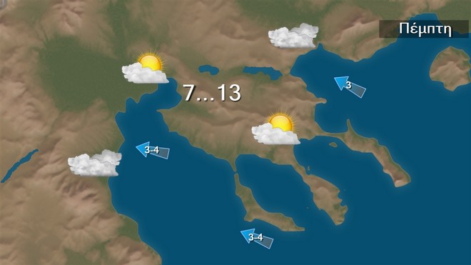 Την Πέμπτη ασθενείς βροχές προβλέπονται τις πρωινές ώρες στην Κρήτη, τα Δωδεκάνησα και τα νησιά του Ιονίου. Στην υπόλοιπη χώρα θα υπάρχουν παροδικές νεφώσεις, αλλά τις βραδινές ώρες στα δυτικά οι νεφώσεις θα αυξηθούν και θα σημειωθούν εκ νέου τοπικές βροχές και κυρίως στα νησιά του Ιονίου σποραδικές καταιγίδες. Τα φαινόμενα μέσα στη νύχτα θα ενταθούν. Η ορατότητα τις πρωινές και βραδινές ώρες στα ηπειρωτικά θα είναι τοπικά περιορισμένη. Οι άνεμοι θα πνέουν στα δυτικά ανατολικοί νοτιοανατολικοί 4 με 6 και στο Ιόνιο βαθμιαία 7 και από τις βραδινές ώρες στα ανοιχτά 8 μποφόρ. Στα ανατολικά θα πνέουν από βόρειες διευθύνσεις 4 με 6 μποφόρ, με βαθμιαία εξασθένηση.
