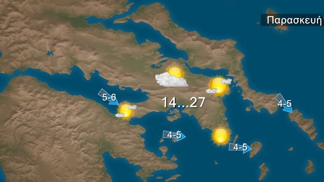 Στην Αττική προβλέπεται αίθριος καιρός, με πρόσκαιρες νεφώσεις τις μεσημβρινές ώρες. Οι άνεμοι θα πνέουν από δυτικές διευθύνσεις 3 με 5 και πρόσκαιρα στα δυτικά το απόγευμα έως 6 μποφόρ Η θερμοκρασία θα κυμανθεί από 14 έως 27 βαθμούς Κελσίου.