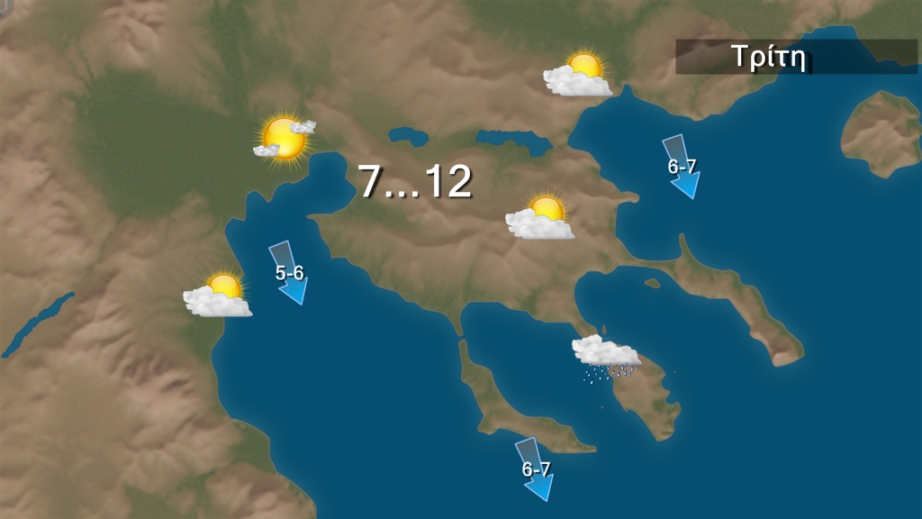 Την Τρίτη αρχικά προβλέπονται νεφώσεις με τοπικές βροχές, ενώ πρόσκαιρες χιονοπτώσεις θα εκδηλωθούν στα δυτικά και τα βόρεια ορεινά. Μεμονωμένες καταιγίδες θα έχουμε στα νότια, ενώ βαθμιαία και από τα δυτικά προβλέπεται βελτίωση του καιρού.
