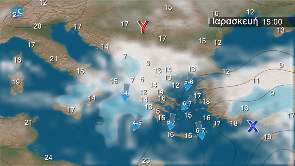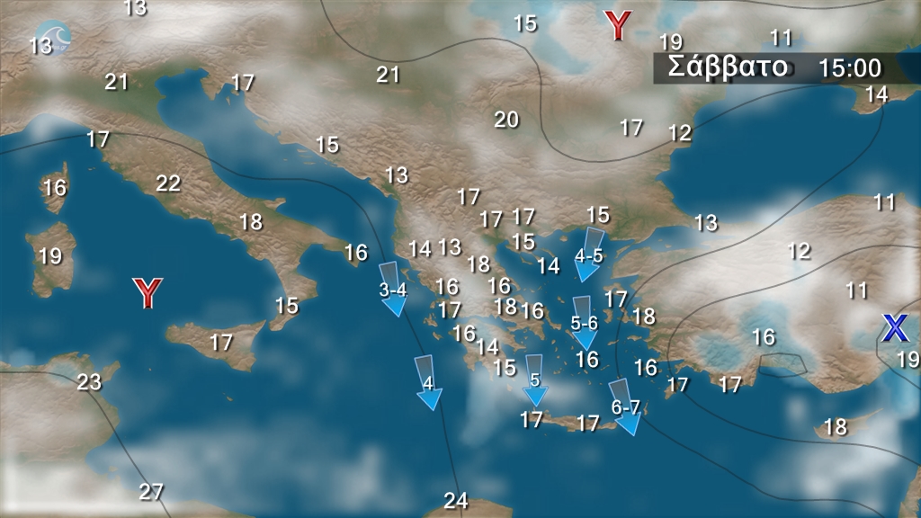 Οι άνεμοι θα πνέουν στα δυτικά από ανατολικές διευθύνσεις 3 με 5 μποφόρ, στρεφόμενοι βαθμιαία σε βορείων διευθύνσεων με την ίδια ένταση. Στα ανατολικά από βόρειες διευθύνσεις 4 με 6 και στο Αιγαίο 7 μποφόρ με βαθμιαία εξασθένηση.