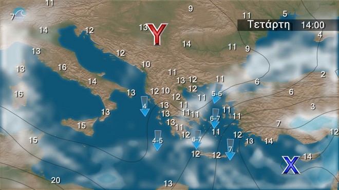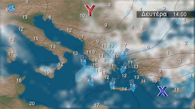 Στη βόρεια και βαθμιαία και στην υπόλοιπη χώρα προβλέπονται νεφώσεις, με τοπικές βροχές τις πρωινές ώρες στην ανατολική Μακεδονία και τη Θράκη, μέχρι τις απογευματινές στην κεντρική Μακεδονία και μέχρι τις βραδινές στην ανατολική Θεσσαλία, τις Σποράδες, την Εύβοια, την ανατολική Στερεά. Από το μεσημέρι θα βρέξει και στην Πελοπόννησο, τις Κυκλάδες, τη βόρεια Κρήτη και το βράδυ στο νότιο Ιόνιο όπου θα εκδηλωθούν και μεμονωμένες καταιγίδες. Παροδικές χιονοπτώσεις θα σημειωθούν στα ηπειρωτικά ορεινά, αρχικά της βόρειας και βαθμιαία της υπόλοιπης χώρας. Οι άνεμοι θα πνέουν βορειοανατολικοί, στα δυτικά 3 με 5 και βαθμιαία 6 και στο Ιόνιο πρόσκαιρα τοπικά 7 μποφόρ, στα ανατολικά 6 με 7 και στο Αιγαίο τοπικά 8 μποφόρ. Η θερμοκρασία θα σημειώσει πτώση κυρίως ως προς τις μέγιστες τιμές της, η οποία στην κεντρική και τη βόρεια χώρα θα είναι αισθητή.