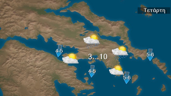 Την Τετάρτη προβλέπεται γενικά αίθριος καιρός με τοπικές νεφώσεις στην Εύβοια, τις Σποράδες, την ανατολική Στερεά, την ανατολική και νότια Πελοπόννησο, τις Κυκλάδες και την Κρήτη όπου θα σημειωθούν ασθενείς βροχές και λίγα χιόνια στα ορεινά. Οι άνεμοι θα πνέουν από βόρειες διευθύνσεις 4 με 5 και στο Αιγαίο 6 με 7 μποφόρ με εξασθένηση. Η θερμοκρασία θα σημειώσει μικρή πτώση και στα βόρεια δεν θα ξεπεράσει τους 7 με 8 βαθμούς, στα ανατολικά ηπειρωτικά τους 10 με 11 βαθμούς και μόνο κατά τόπους στα δυτικά και την ανατολική νησιωτική χώρα θα φτάσει τους 12 με 13 βαθμούς Κελσίου.Τις πρωινές και βραδινές ώρες στα ηπειρωτικά θα σημειωθεί παγετός, ο οποίος στα βόρεια θα είναι κατά τόπους ισχυρός.