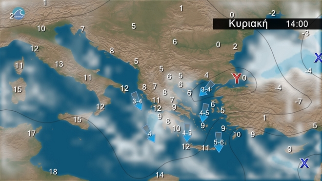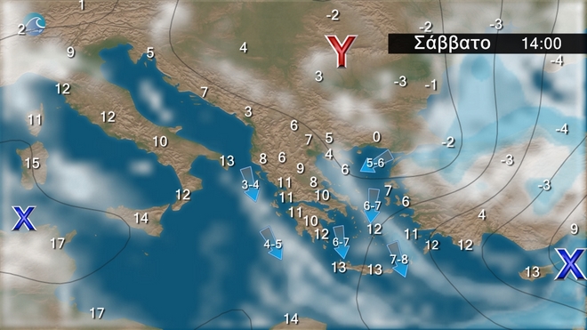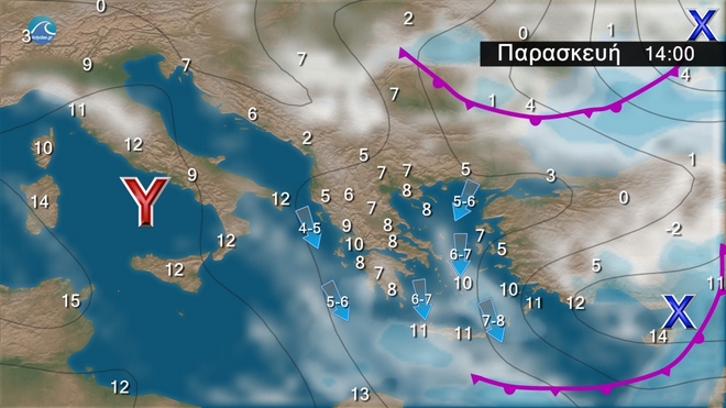 - Την Πέμπτη η θερμοκρασία θα πέσει κατά 12 με 15 βαθμούς και θα επικρατήσουν βοριάδες 8 μποφόρ.