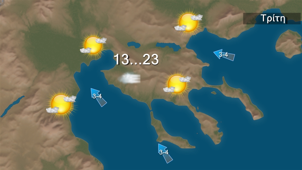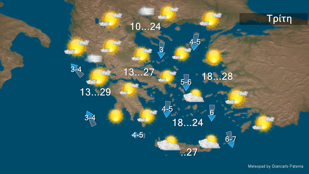 - Η θερμοκρασία θα έχει μέγιστη τιμή στα βόρεια τους 24 βαθμούς και στα υπόλοιπα ηπειρωτικά τους 27 με 29 βαθμούς Κελσίου