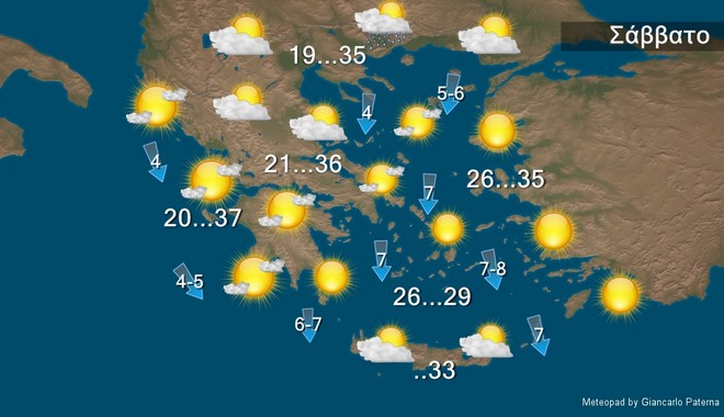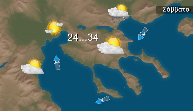 Για σήμερα Σάββατο σε όλη τη χώρα προβλέπεται γενικά αίθριος καιρός. Τις μεσημβρινές και απογευματινές ώρες στα βορεια θα εκδηλωθούν τοπικοί όμβροι και μεμονωμένες καταιγίδες Οι άνεμοι θα πνέουν από βόρειες διευθύνσεις στο Ιόνιο 4 με 5 μποφόρ στο Αιγαίο 6 με 7 και το πρωί τοπικά 8 μποφόρ με εξασθένηση αργότερα . Η θερμοκρασία δεν θα αλλάξει σημαντικά και θα φθάσει κατά τόπους στα ηπειρωτικά τους 35 με 37 βαθμούς Κελσίου.