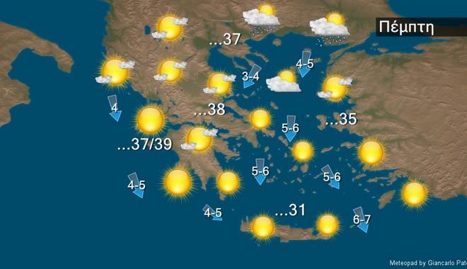 Οι άνεμοι θα πνέουν στα δυτικά, τη Θεσσαλία και τη Μακεδονία μεταβλητοί 3 με 4 και πρόσκαιρα το απόγευμα στο Ιόνιο δυτικοί βορειοδυτικοί έως 5 μποφόρ. Στην υπόλοιπη χώρα θα πνέουν βόρειοι 4 με 6 και στο Αιγαίο 6 με 7 μποφόρ. Η θερμοκρασία δεν θα σημειώσει αξιόλογη μεταβολή και θα φτάσει, στα ηπειρωτικά τους 37 με 38 και κατά τόπους στα δυτικά τους 39 βαθμούς, στα νησιά του Ιονίου και του ανατολικού Αιγαίου τους 35, ενώ στις Κυκλάδες και τη βόρεια Κρήτη δεν θα ξεπεράσει τους 31 βαθμούς Κελσίου.