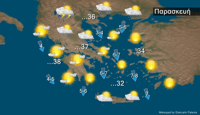Στα ανατολικά λίγες νεφώσεις παροδικά αυξημένες κυρίως στα ηπειρωτικά όπου θα σημειωθούν τοπικές βροχές και τις απογευματινές ώρες μεμονωμένες καταιγίδες. Στα δυτικά γενικά αίθριος με πρόσκαιρες νεφώσεις στα ηπειρωτικά το μεσημέρι – απόγευμα. Οι άνεμοι θα πνέουν, στα δυτικά και τη Μακεδονία μεταβλητοί 2 με 4 και στις υπόλοιπες περιοχές βόρειοι 4 με 6 και στο Αιγαίο τοπικά 7 τοπικά 8 μποφόρ. Η θερμοκρασία θα σημειώσει μικρή πτώση στα ανατολικά.