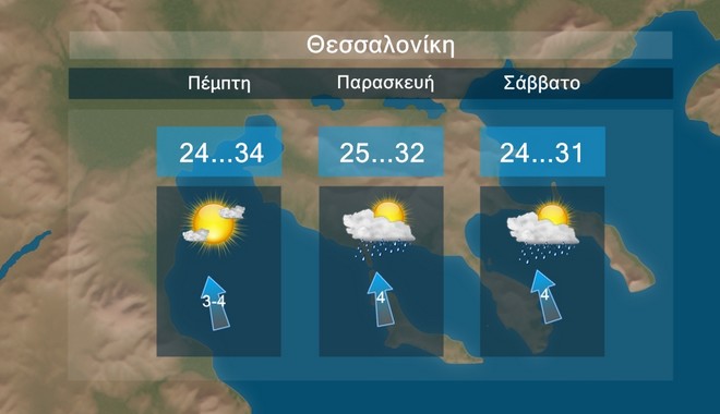 Στη Θεσσαλονίκη προβλέπεται σχεδόν αίθριος καιρός με τοπικές μόνο νεφώσεις και πρόσκαιρη αστάθεια την Παρασκευή και το Σάββατο. Η θερμοκρασία θα έχει μέγιστες τιμές περί τους 31 με 34 βαθμούς Κελσίου.