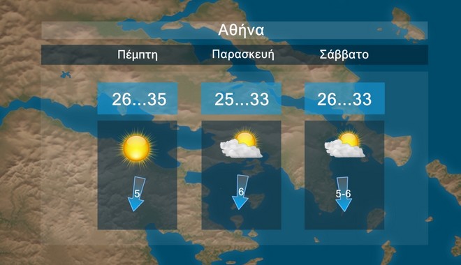 Στην Αθήνα προβλέπεται σχεδόν αίθριος καιρός με τοπικές νεφώσεις κατά περιόδους Η θερμοκρασία θα έχει μέγιστες τιμές περί τους 33 με 35 βαθμούς Κελσίου