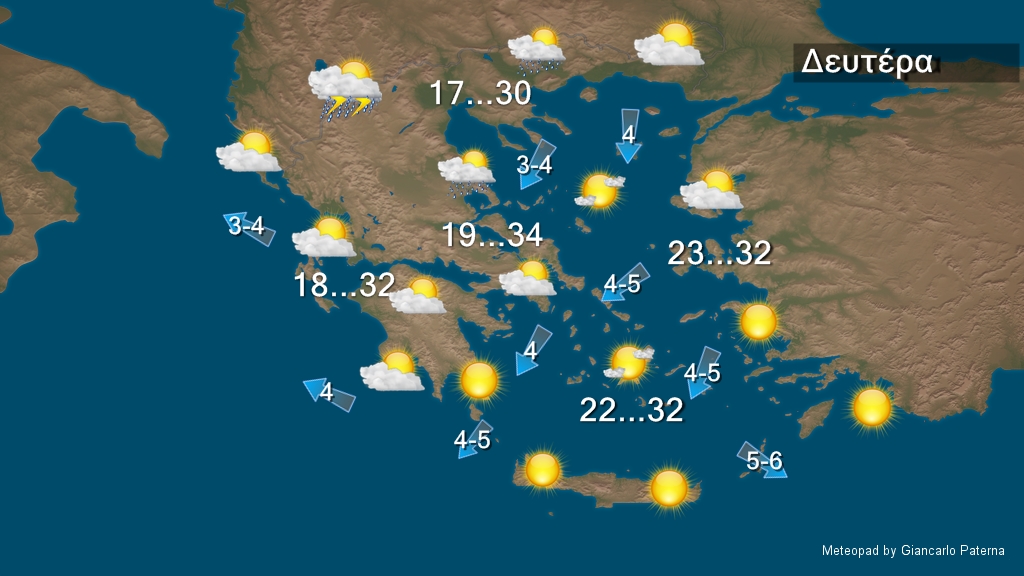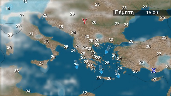Οι άνεμοι θα πνέουν από βόρειες διευθύνσεις 3 με 5 μποφόρ, που βαθμιαία στο Ιόνιο και τα ηπειρωτικά, θα στραφούν σε νοτιοανατολικούς με την ίδια ένταση. Η θερμοκρασία θα σημειώσει μικρή άνοδο κυρίως στα κεντρικά και νότια και θα φτάσει σε κανονικές για την εποχή τιμές με μέγιστη τιμή στα βόρεια τους 30 βαθμούς και στα υπόλοιπα τους 32 με 34 βαθμούς Κελσίου.
