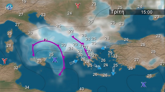 Οι άνεμοι θα πνέουν βορειοανατολικοί 3 με 4 που από το απόγευμα θα στραφούν σε βόρειους βορειοδυτικούς 4 με 5 μποφόρ. Η θερμοκρασία σε μικρή πτώση στα κεντρικά και βόρεια.