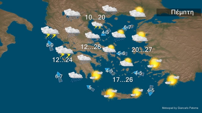 Σήμερα Πέμπτη προβλέπεται κακοκαιρία στη δυτική, κεντρική και τη βόρεια Ελλάδα με ισχυρές βροχές και καταιγίδες που θα συνοδεύονται πρόσκαιρα από χαλαζοπτώσεις και ισχυρούς ανέμους. Στην υπόλοιπη χώρα θα υπάρχουν λίγες νεφώσεις που βαθμιαία θα αυξηθούν και από τις βραδινές ώρες θα σημειωθούν τοπικές βροχές στα υπόλοιπα ηπειρωτικά και την Εύβοια. Οι άνεμοι θα πνέουν στα δυτικά νότιοι νοτιοανατολικοί 6 με 8 και στο Ιόνιο πρόσκαιρα 9 μποφόρ. Στα υπόλοιπα από ανατολικές διευθύνσεις 4 με 5 ενισχυόμενοι το βράδυ στο βόρειο Αιγαίο σε 6 με 7 μποφόρ. Η θερμοκρασία θα σημειώσει πτώση ως προς τις μέγιστες τιμές της στα δυτικά, τα κεντρικά και τα βόρεια και στα βόρεια θα φτάσει τους 20 βαθμούς και στα υπόλοιπα τους 24 με 27 βαθμούς Κελσίου.