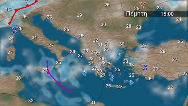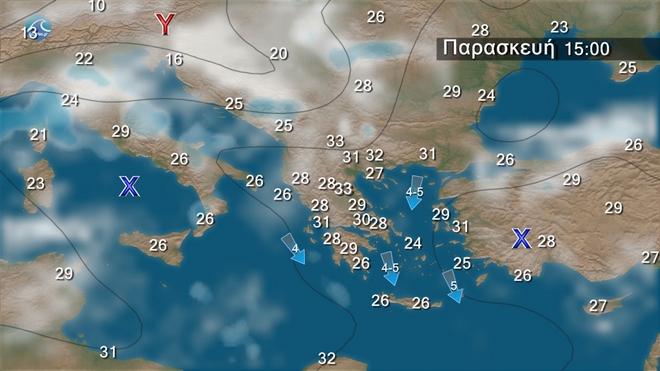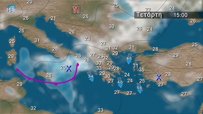 Στο Ιόνιο και τα ηπειρωτικά λίγες νεφώσεις οι οποίες μετά το μεσημέρι στα ηπειρωτικά θα αυξηθούν και θα εκδηλωθούν σποραδικοί όμβροι στα ορεινά κυρίως της δυτικής και βόρειας χώρας και πιθανόν μεμονωμένες καταιγίδες στα βόρεια. Στην υπόλοιπη χώρα γενικά αίθριος καιρός. Οι άνεμοι θα είναι στα δυτικά μεταβλητοί 3 με 4, στα ανατολικά βόρειοι 3 με 5 και στο Αιγαίο τοπικά 6 μποφόρ. Η θερμοκρασία θα σημειώσει πτώση κυρίως στα ανατολικά και τα βόρεια.