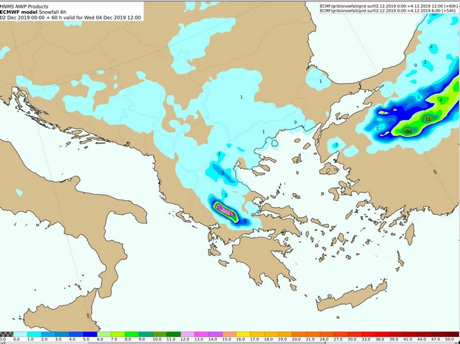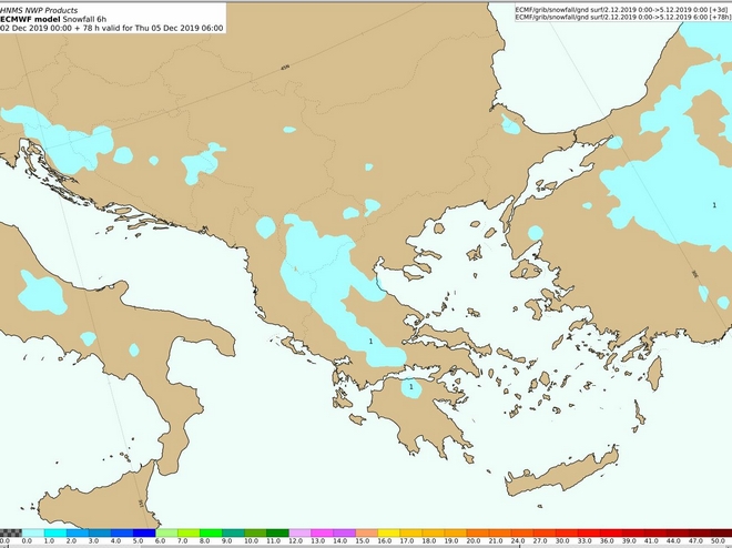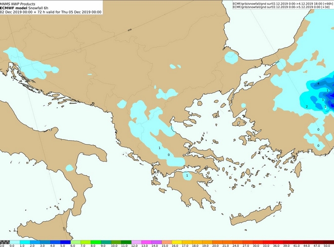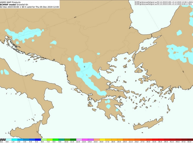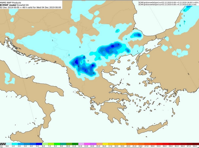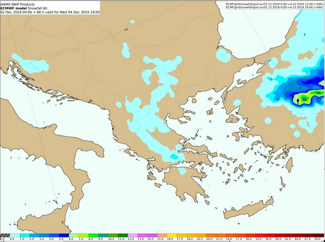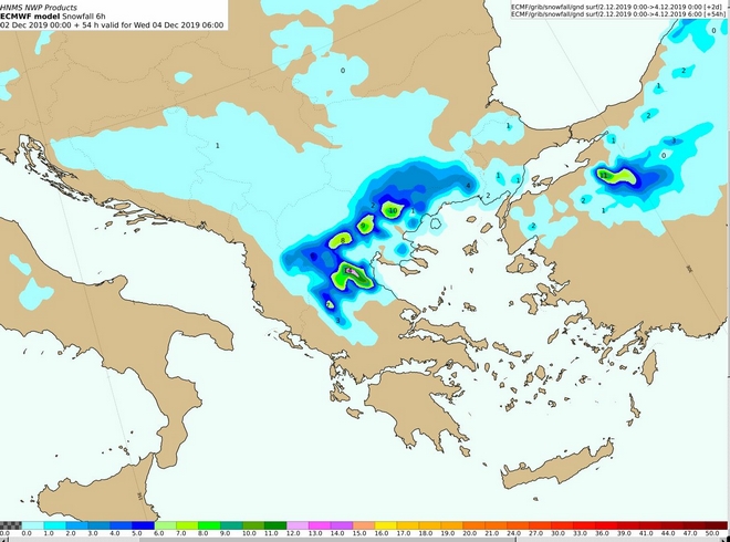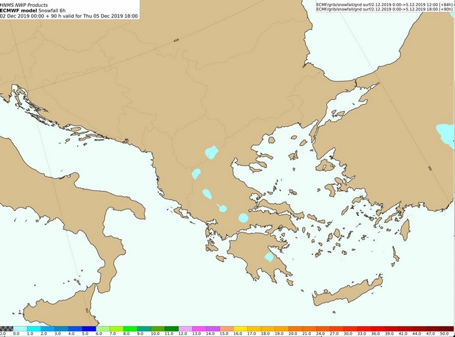 Αναλυτικά με μπλε χρώμα οι χιονοπτώσεις που θα σημειωθούν στην ενδοχώρα.