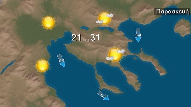 Την Παρασκευή προβλέπεται γενικά αίθριος καιρός με λίγες πρόσκαιρες νεφώσεις τις μεσημβρινές και απογευματινές ώρες στα ηπειρωτικά ορεινά. Οι άνεμοι θα πνέουν από βόρειες διευθύνσεις 3 με 5, στο Αιγαίο τοπικά 6 και στα νοτιοανατολικά πρόσκαιρα 7 μποφόρ.