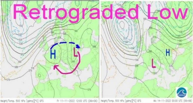 Η μεταβολή του καιρού οφείλεται σε ένα οπισθοδρομούν (ή ανάδρομο-Retrograded) χαμηλό στην ανώτερη ατμόσφαιρα (500 hPa) το οποίο κινείται προς την αντίθετη κατεύθυνση από την συνήθη και τυπική κλιματολογικά κίνησή του. Αυτό το σύστημα όπως θα παρατηρήσετε στο βίντεο που ακολουθεί, κινείται από τα Βορειοανατολικά προς τα Νοτιοδυτικά.