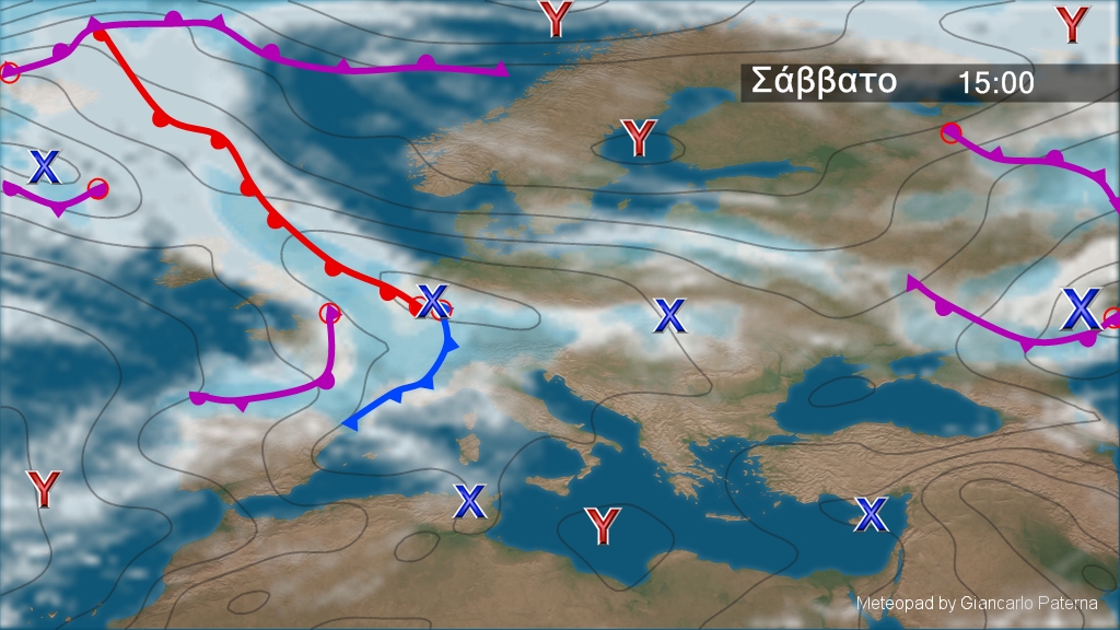 Στον γενικό χάρτη της Ευρώπης διακρίνεται το ισχυρό βαρομετρικό χαμηλό που επηρεάζει τη Δυτική Ευρώπη με ισχυρές βροχές και καταιγίδες.