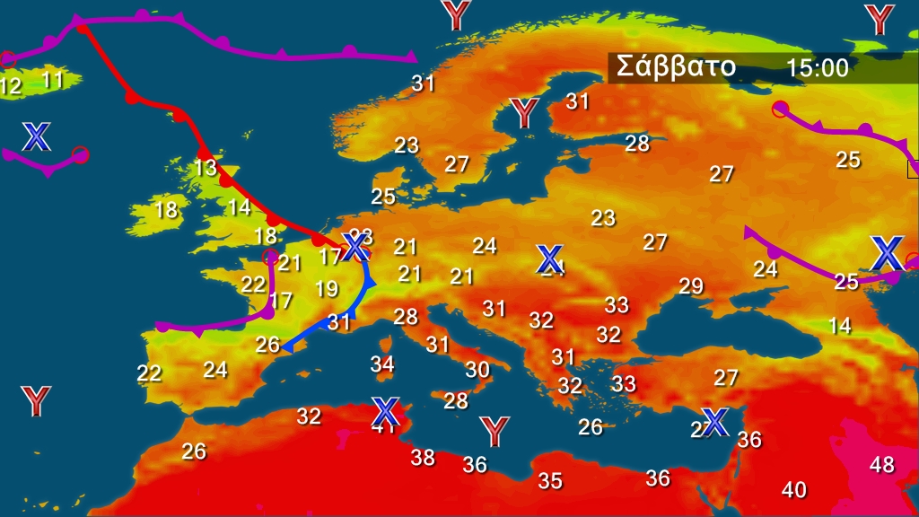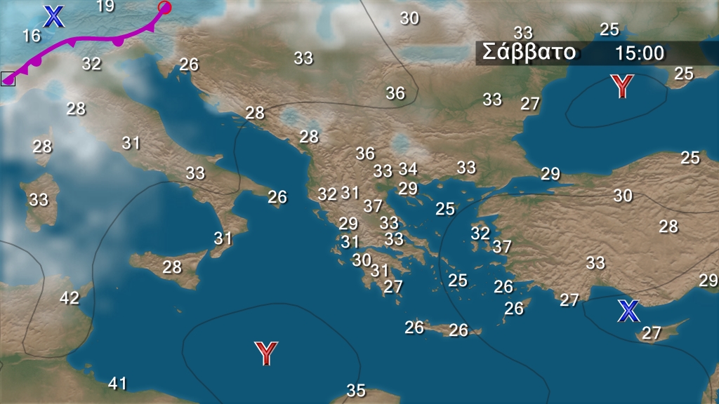 Το Σάββατο προβλέπεται γενικά αίθριος καιρός με πρόσκαιρες νεφώσεις στα ηπειρωτικά τις μεσημβρινές και απογευματινές ώρες, οπότε θα εκδηλωθούν τοπικοί όμβροι στα βόρεια και κεντρικά ορεινά . Οι άνεμοι θα πνέουν από βόρειες διευθύνσεις έως 5 μπ στο Αιγαίο  Η  θερμοκρασία θα φτάσει κατά τόπους στα ηπειρωτικά τους 36 με 38 βαθμούς Κελσίου και στα νησιά του Αιγαίου τους 30 με 34 βαθμούς Κελσίου.