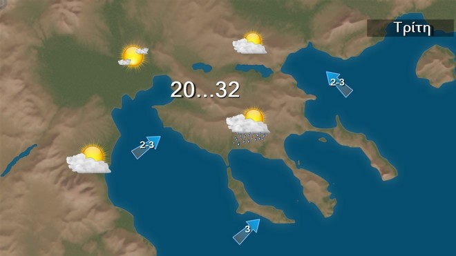 Την Τρίτη προβλέπεται γενικά αίθριος καιρός. Τις μεσημβρινές και απογευματινές ώρες στο Ιόνιο και στα ηπειρωτικά θα αναπτυχθούν νεφώσεις και θα εκδηλωθούν τοπικοί όμβροι ή μεμονωμένες καταιγίδες στα βορειότερα τμήματα. Οι άνεμοι θα πνέουν από δυτικές διευθύνσεις 3 με 4 και τοπικά 5 μποφόρ.