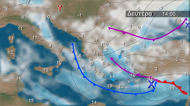Αρκετά σκαμπανεβάσματα θα έχει ο καιρός τις επόμενες μέρες με κύρια χαρακτηριστικά τις νέες χιονοπτώσεις και τις καταιγίδες. Τη Δευτέρα στα βορειοδυτικά προβλέπονται λίγες νεφώσεις παροδικά αυξημένες. Στα υπόλοιπα προβλέπονται νεφώσεις παροδικά αυξημένες με βροχές η χιονόνερο στα νότια κυρίως θαλάσσια – παραθαλάσσια τμήματα, και χιονοπτώσεις στα ορεινά-ημιορεινά καθώς και στα πεδινά της κεντρικής και βόρειας χώρας.