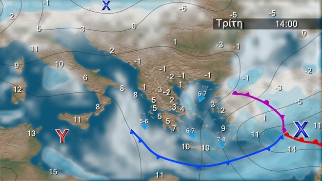 Την Τρίτη στα δυτικά και τα βόρεια ηπειρωτικά, προβλέπονται λίγες νεφώσεις που το απόγευμα στο Ιόνιο κι από το βραδύ στα υπόλοιπα θα αυξηθούν. Στις υπόλοιπες περιοχές προβλέπονται νεφώσεις παροδικά αυξημένες με βροχή η χιονόνερο στα νότια θαλάσσια – παραθαλάσσια και χιονοπτώσεις στα υπόλοιπα, κατά τόπους πιο πυκνές στην ανατολική Στερεά, την Εύβοια και τις Σποράδες. Υπάρχει πιθανότητα σποραδικών καταιγίδων στα νότια θαλάσσια – παραθαλάσσια τμήματα. Σταδιακά τα φαινόμενα από το απόγευμα και από τα βόρεια θα εξασθενήσουν και το βράδυ θα περιοριστούν στα νοτιοανατολικά.
