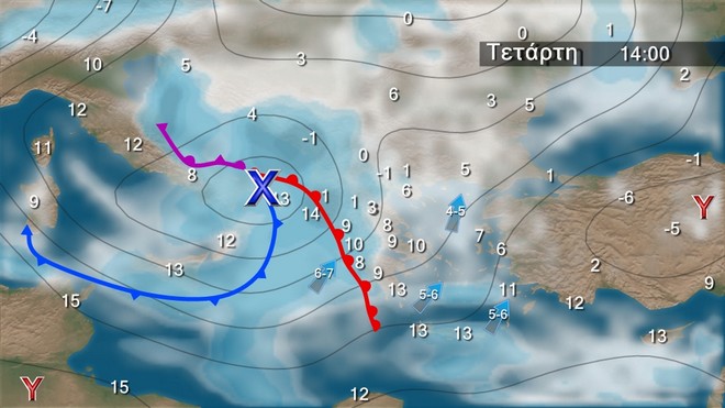 Την Τετάρτη προβλέπεται νέα επιδείνωση από τα δυτικά με τοπικές βροχές, σποραδικές καταιγίδες κυρίως στα θαλάσσια – παράκτια και χιονοπτώσεις στα ορεινά – ημιορεινά καθώς και σε περιοχές της βόρειας χωράς με χαμηλότερο υψόμετρο. Τα φαινόμενα αρχικά στα δυτικά και από το απόγευμα σταδιακά στα υπόλοιπα πιθανώς κατά τόπους θα είναι έντονα.