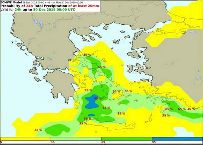 β. Ισχυρές βροχές και καταιγίδες κατά διαστήματα, θα εκδηλώνονται στις Κυκλάδες, την Κρήτη και τα Δωδεκάνησα. Στον χάρτη που ακολουθεί μπορούμε να δούμε σε ποιές περιοχές έχουμε τις περισσότερες πιθανότητες να πέσουν πάνω απο 20 mm βροχής και αυτό αφορά την Κυριακή για όλο το 24ωρο.