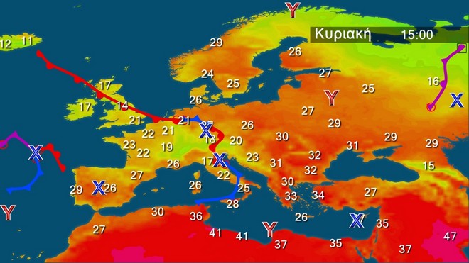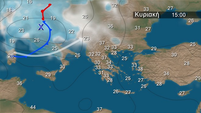 Την Κυριακή προβλέπεται γενικά αίθριος καιρός με πρόσκαιρες νεφώσεις στα ηπειρωτικά τις μεσημβρινές και απογευματινές ώρες, οπότε ενδέχεται να εκδηλωθούν τοπικοί όμβροι στα βόρεια ορεινά. Οι άνεμοι θα πνέουν από βόρειες διευθύνσεις έως 5 μποφόρ στο Αιγαίο Η θερμοκρασία θα φτάσει στα ηπειρωτικά τους 36 με 38 και κατά τόπους 39 με 40 βαθμούς Κελσίου και στα νησιά του Αιγαίου τους 31 με 35 βαθμούς Κελσίου.