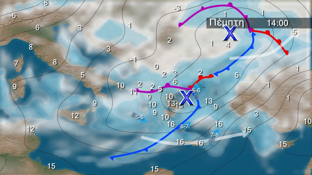 Την Πέμπτη προβλέπονται νεφώσεις παροδικά αυξημένες με τοπικές βροχές κυρίως στα δυτικά, τα νότια και το ανατολικό Αιγαίο, οπού θα εκδηλωθούν και σποραδικές καταιγίδες κυρίως στις θαλάσσιες και παραθαλάσσιες περιοχές. Χιονοπτώσεις θα σημειωθούν στα ηπειρωτικά ορεινά και στα ημιορεινά της βόρειας χώρας.