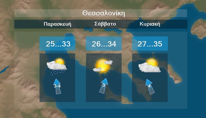 Στη Θεσσαλονίκη προβλέπονται παροδικές νεφώσεις με πιθανή αστάθεια την Παρασκευή Η θερμοκρασία θα έχει μέγιστες τιμές περί τους 33 με 35 βαθμούς Κελσίου .