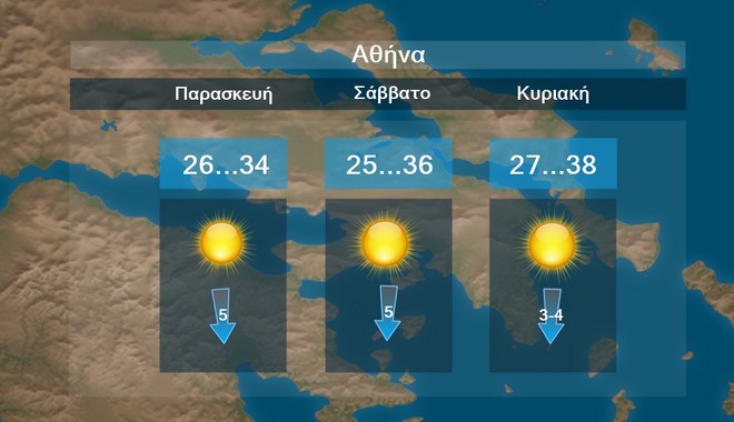 Στην Αθήνα τις επόμενες ημέρες προβλέπεται αίθριος καιρός . Η θερμοκρασία θα κυμανθεί μεταξύ 34 και 38 βαθμών Κελσίου