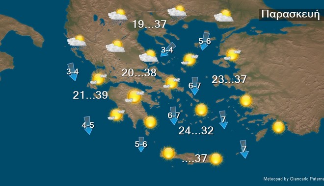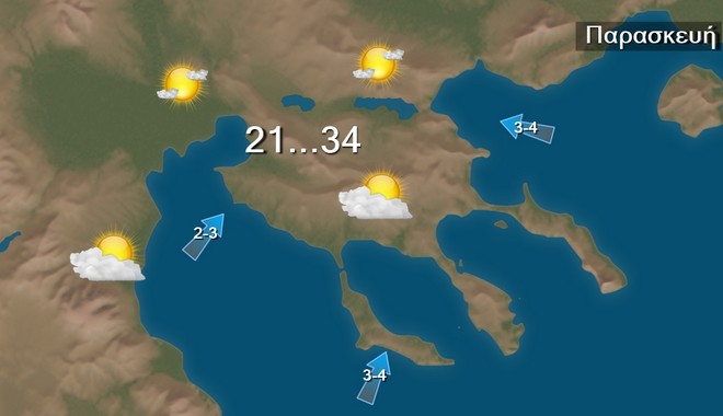 Την Παρασκευή προβλέπεται γενικά αίθριος καιρός. Τις μεσημβρινές και απογευματινές ώρες στα ηπειρωτικά θα αναπτυχθούν κατά τόπους νεφώσεις και στα κεντρικά και βόρεια ορεινά θα εκδηλωθούν τοπικοί όμβροι και κυρίως στα ορεινά της Μακεδονίας μεμονωμένες καταιγίδες. Οι άνεμοι θα πνέουν στα δυτικά από βόρειες διευθύνσεις 3 με 5, στα ανατολικά 4 με 6 και στο Αιγαίο τοπικά 7 μποφόρ. Η θερμοκρασία θα σημειώσει μικρή άνοδο στα δυτικά και μικρή πτώση στα ανατολικά. Στα ηπειρωτικά θα φτάσει τους 36 με 38 και τοπικά στα δυτικά τους 39 βαθμούς Κελσίου. Στις περισσότερες νησιωτικές περιοχές θα φτάσει τους 35 με 37 βαθμούς, ενώ στις Κυκλάδες και τη βόρεια Κρήτη δεν θα ξεπεράσει τους 32 βαθμούς Κελσίου.