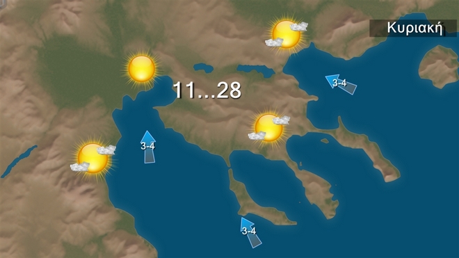 Σήμερα Κυριακή σε όλη τη χώρα προβλέπεται βελτιωμένος και σχεδόν αίθριος καιρός Η ορατότητα τις πρωινές και τις βραδινές ώρες στα δυτικά και τα βόρεια θα είναι τοπικά περιορισμένη. Οι άνεμοι θα πνέουν στα πελάγη βόρειοι βορειοδυτικοί 3 με 5 και στα Δωδεκάνησα πρόσκαιρα τοπικά έως 6 μποφόρ. Η θερμοκρασία θα σημειώσει άνοδο στο Ιόνιο και τα ηπειρωτικά και θα φτάσει στα βόρεια τους 30 βαθμούς και στην υπόλοιπη χώρα τους 30 με 32 βαθμούς Κελσίου στα ηπειρωτικά τους 27 με 29 στα νησιά
