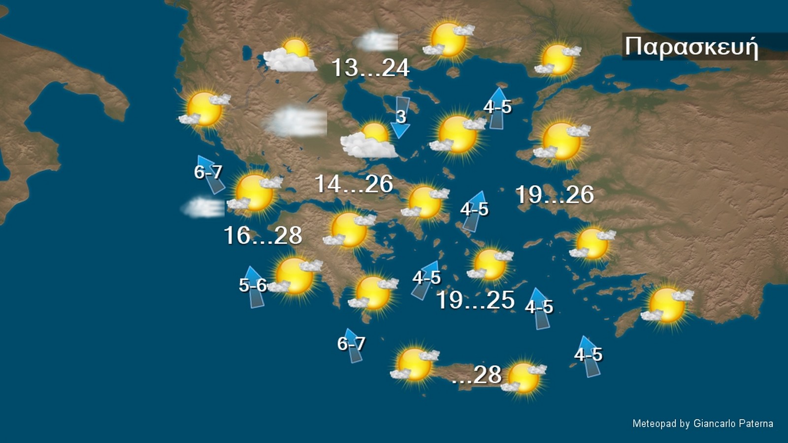 Στα δυτικά νεφώσεις με τοπικές βροχές και κυρίως στα βορειοδυτικά μέχρι το μεσημέρι σποραδικές καταιγίδες. Στα υπόλοιπα αραιές νεφώσεις κατά διαστήματα πιο πυκνές. Η ορατότητα θα είναι τοπικά περιορισμένη τις πρωινές και βραδινές ώρες και πιθανόν να σχηματιστούν τοπικές ομίχλες. Οι μετεωρολογικές συνθήκες ευνοούν τη μεταφορά αφρικανικής σκόνης στην περιοχή μας. Οι άνεμοι θα πνέουν στα δυτικά νότιοι νοτιοανατολικοί 4 με 5 μποφόρ στρεφόμενοι σταδιακά από τα βόρεια σε βόρειους με την ίδια ένταση. Στα ανατολικά οι άνεμοι θα πνέουν από νότιες διευθύνσεις 4 με 5 και τοπικά στο Αιγαίο 6 μποφόρ. Η θερμοκρασία θα σημειώσει μικρή πτώση στα βορειοδυτικά ως προς τις μέγιστες τιμές της. Στις υπόλοιπες περιοχές θα κυμανθεί σε σχετικά υψηλές τιμές.