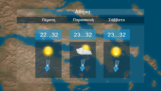 Στην Αθήνα προβλέπεται αίθριος καιρός. Η μέγιστη θερμοκρασία θα κυμαίνεται περί τους 32 βαθμούς Κελσίου.