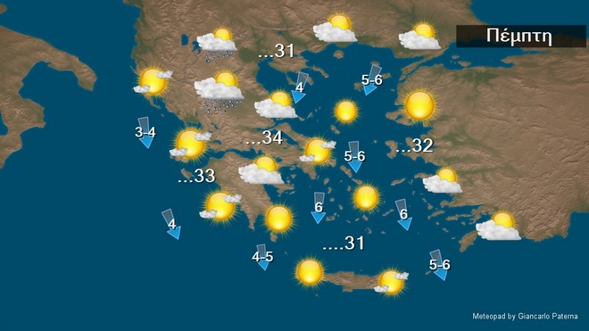 Στη Μακεδονία και τα βόρεια τμήματα της Θεσσαλίας παροδικά αυξημένες νεφώσεις με τοπικές βροχές και μεμονωμένες καταιγίδες κυρίως το μεσημέρι – απόγευμα. Στα υπόλοιπα ηπειρωτικά γενικά αίθριος καιρός με τοπικές νεφώσεις τις μεσημβρινές και απογευματινές ώρες όπου και στα ορεινά ενδέχεται να σημειωθούν πρόσκαιροι όμβροι. Στη νησιωτική χώρα αίθριος καιρός. Οι άνεμοι θα πνέουν βόρειοι βορειοδυτικοί 3 με 5 και στο κεντρικό και το νοτιοανατολικό Αιγαίο 6 μποφόρ. Η θερμοκρασία θα σημειώσει πρόσκαιρη μικρή πτώση στα βόρεια ως προς τις μέγιστες τιμές της και θα κυμαίνεται σε κανονικά για την εποχή επίπεδα. Θα φτάσει στα βόρεια και τη νησιωτική χώρα έως τους 31 βαθμούς και στα υπόλοιπα ηπειρωτικά τους 32 με 34 βαθμούς Κελσίου.