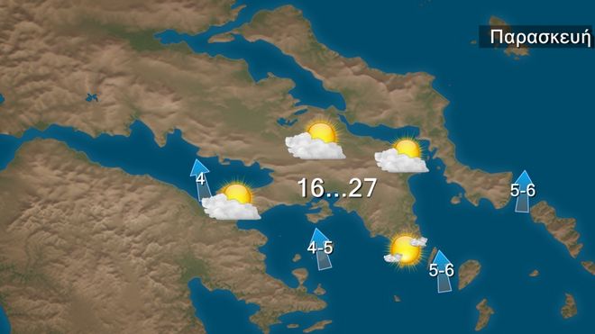 Σήμερα Παρασκευή σε όλη τη χώρα προβλέπονται αραιές νεφώσεις και άνοδος της θερμοκρασίας. Από το βράδυ θα σημειωθούν τοπικές βροχές στα βορειοδυτικά, ενώ ευνοείται η μεταφορά σκόνης από την Αφρική στα δυτικά και τα νότια. Η ορατότητα τις πρωινές ώρες θα είναι τοπικά περιορισμένη. Οι άνεμοι θα πνέουν νότιοι νοτιοανατολικοί, 5 με 6 και στα πελάγη τοπικά 7 μποφόρ. Η θερμοκρασία θα σημειώσει άνοδο κυρίως στα ηπειρωτικά και θα έχει μέγιστη τιμή στα βόρεια τους 28 βαθμούς στα υπόλοιπα ηπειρωτικά και το Ιόνιο τους 29 με 30 και στα νησιά του Αιγαίου τους 25 με 26 βαθμούς Κελσίου και τοπικά στη βόρεια Κρήτη έως 30 βαθμούς .