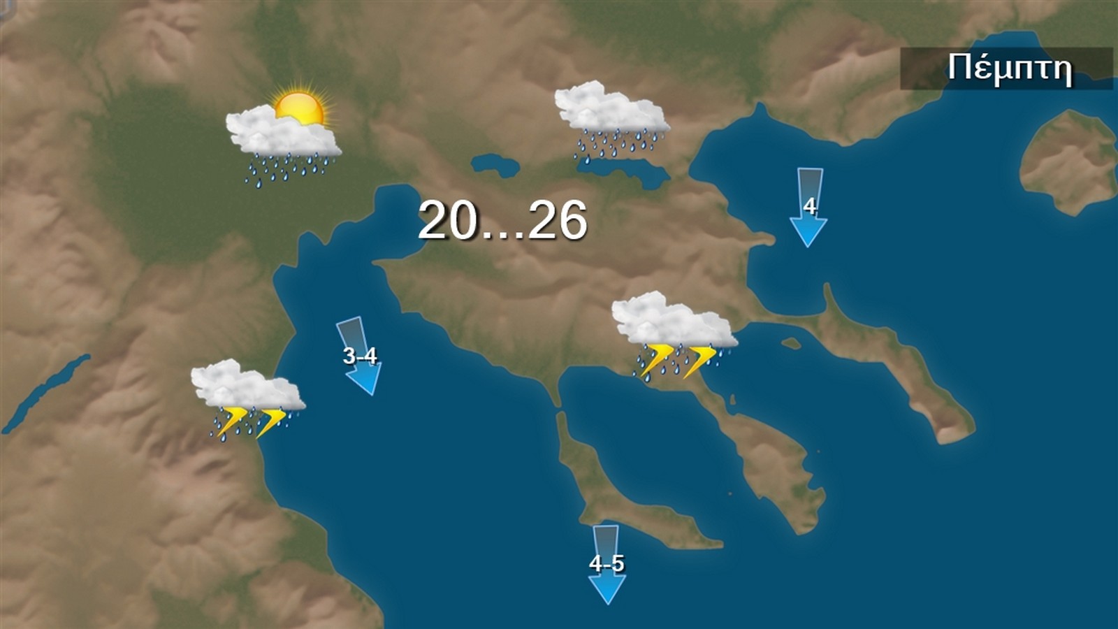 Οι άνεμοι θα πνέουν στα δυτικά ανατολικοί βορειοανατολικοί και στα ανατολικά βόρειοι βορειοανατολικοί 4 με 6, στα πελάγη τοπικά 7 μποφόρ. Η θερμοκρασία θα σημειώσει μικρή άνοδο. Θα φθάσει στα βορειδυτικά τους 24 με 26, στα υπόλοιπα ηπερωτικά τους 27 με 30 και στη νησιωτική χώρα τους 29 με 31 βαθμούς Κελσίου.
