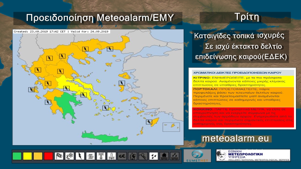 Την Τρίτη τα ισχυρά φαινόμενα, τα οποία στη δυτική Ελλάδα από το απόγευμα θα εξασθενήσουν, πιθανώς να επηρεάσουν πρόσκαιρα τη Θεσσαλία, τη Μακεδονία και τη Θράκη τις μεσημβρινές και απογευματινές ώρες. Από αργά το απόγευμα της Τρίτης και μέχρι τις πρώτες πρωινές ώρες της Τετάρτης (25-09-2019) θα επηρεαστούν τα νησιά του ανατολικού Αιγαίου και τα Δωδεκάνησα.