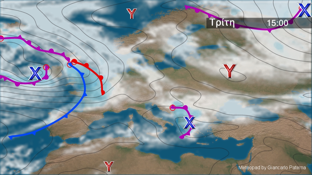 Στον γενικό χάρτη της Ευρώπης διακρίνεται ένας ισχυρός αντικυκλώνας στην ανατολική Ευρώπη ενώ στα βορειοδυτικά Βαλκάνια Ιταλία υπάρχει ένα βαρομετρικό χαμηλό το οποίο θα μας επηρεάσει την Τρίτη