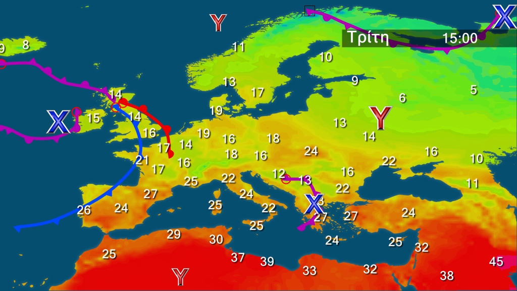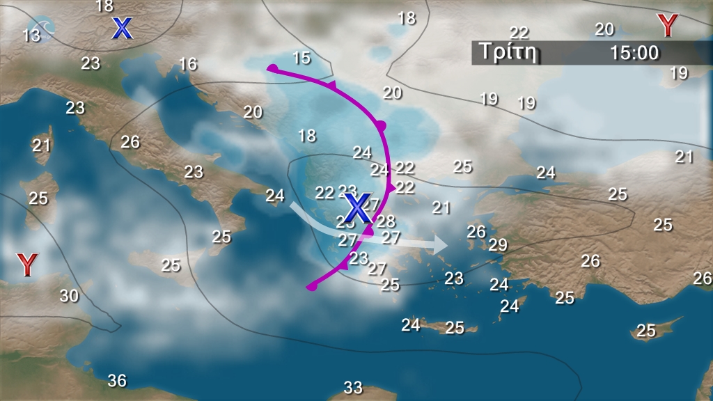 Την Τρίτη στη δυτική Ελλάδα προβλέπονται νεφώσεις με βροχές και καταιγίδες πιθανόν κατά τόπους ισχυρές που το βράδυ θα εξασθενήσουν. Τα φαινόμενα βαθμιαία θα επεκταθούν στα κεντρικά και τα βόρεια και από το βράδυ στην ανατολική νησιωτική χώρα, και είναι πιθανό να είναι κατά τόπους ισχυρά στη Μακεδονία, τη Θράκη, τα νησιά του ανατολικού Αιγαίου και τα Δωδεκάνησα. Οι άνεμοι στα δυτικά θα πνέουν αρχικά από νότιες διευθύνσεις 3 με 5 και στο Ιόνιο τοπικά 6 μποφόρ, ενώ μετά το μεσημέρι θα στραφούν σε βορειοδυτικούς με την ίδια ένταση. Στα ανατολικά νότιοι νοτιοδυτικοί 4 με 6 και στο Αιγαίο τοπικά 7 μποφόρ στρεφόμενοι το βράδυ στα βόρεια σε βορειοανατολικούς 3 με 5 μποφόρ.Η θερμοκρασία θα σημειώσει μικρή πτώση στα δυτικά και τα βόρεια. . Η θερμοκρασία θα φτάσει στα δυτικά τους 27 βαθμούς , στα βόρεια τους 25 στα υπόλοιπα ηπειρωτικά τους 28 και στο Αιγαίο τους 27 με 28 βαθμούς Κελσίου.