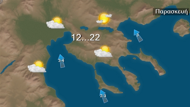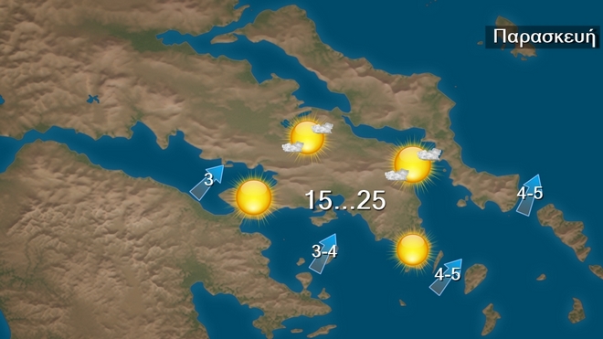Την Παρασκευή προβλέπεται γενικά αίθριος καιρός με αραιές νεφώσεις στα δυτικά και τα βόρεια. Από το βράδυ οι νεφώσεις στα βορειοδυτικά θα πυκνώσουν και θα εκδηλωθούν τοπικές βροχές που κατά τη διάρκεια της νύχτας θα ενταθούν. Η ορατότητα τις πρωινές και τις βραδινές ώρες θα είναι τοπικά περιορισμένη και θα σχηματιστούν κατά τόπους ομίχλες. Οι άνεμοι στα δυτικά θα πνέουν από νότιες διευθύνσεις 3 με 5 και σταδιακά στο Ιόνιο τοπικά 6 μποφόρ και στα ανατολικά μεταβλητοί 3 με 4 που βαθμιαία θα στραφούν σε νότιους νοτιοδυτικούς έως 5 μποφόρ. Η θερμοκρασία θα σημειώσει μικρή πτώση κυρίως στα βόρεια. Η μέγιστη τιμή της θα φτάσει κατά τόπους στα βόρεια τους 20 με 23 βαθμούς και στα υπόλοιπα τους 23 με 25 βαθμούς Κελσίου.