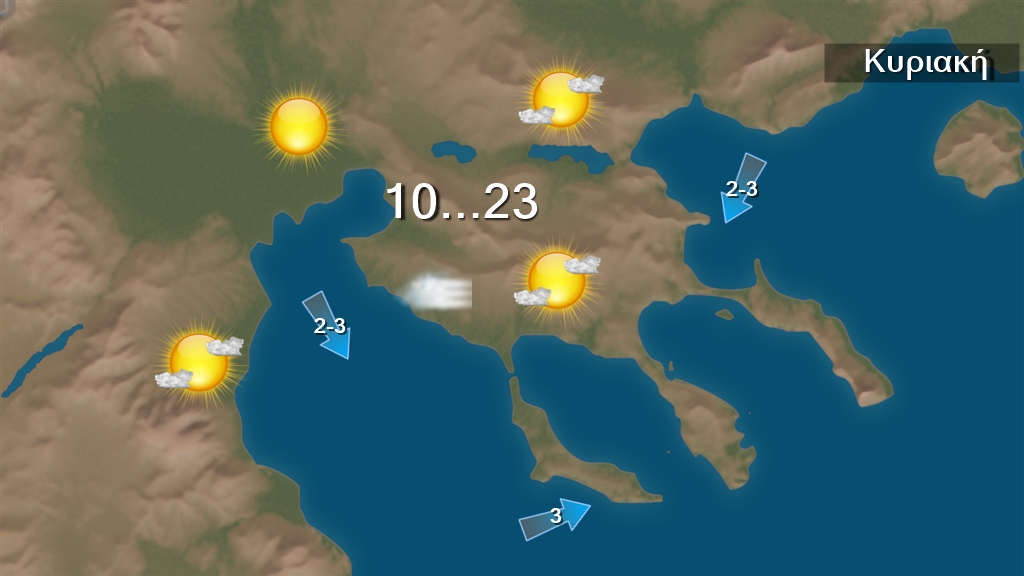Στη Θεσσαλονίκη προβλέπεται γενικά αίθριος καιρός Το πρωί η ορατότητα θα είναι κατά τόπους περιορισμένη. Οι άνεμοι θα πνέουν μεταβλητοί έως 3 μποφόρ. Η θερμοκρασία θα κυμανθεί από 10 έως 23 βαθμούς Κελσίου.