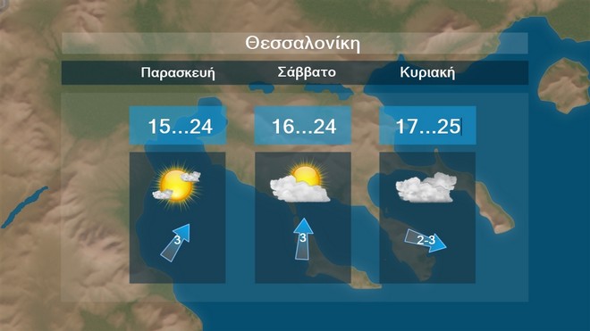 Στη Θεσσαλονίκη προβλέπονται τοπικές νεφώσεις αυξημένες την Κυριακή. Η θερμοκρασία θα κυμαίνεται μεταξύ 24 και 25 βαθμών Κελσίου.