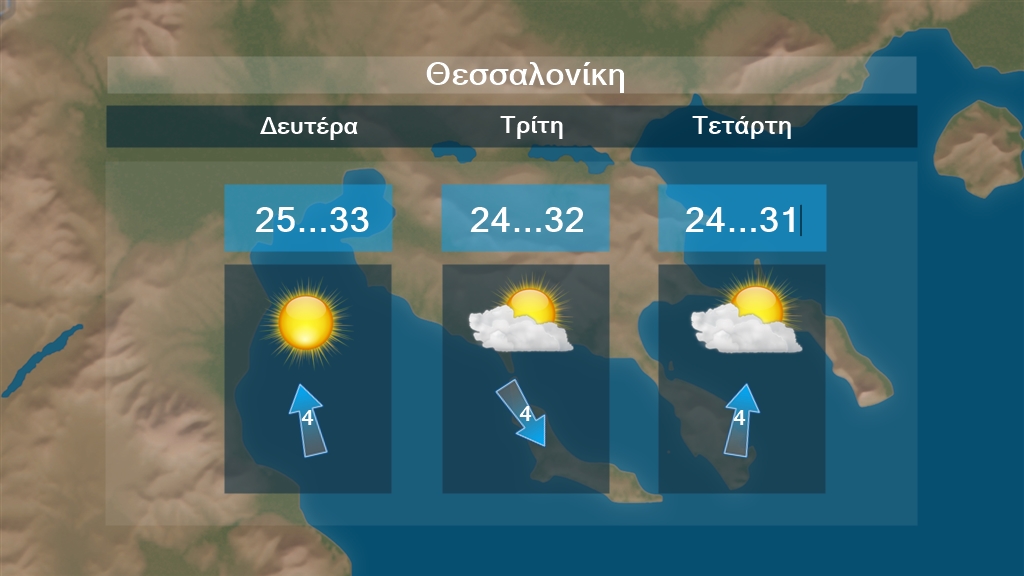 Στη Θεσσαλονίκη προβλέπονται τοπικές νεφώσεις Τρίτη και Τετάρτη. Η θερμοκρασία θα κυμαίνεται περί τους 31 με 33 βαθμούς Κελσίου.