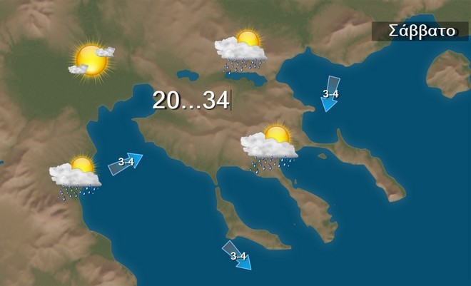 Άνεμοι μεταβλητοί 2 με 3 και πρόσκαιρα το μεσημέρι-απόγευμα νοτίων διευθύνσεων έως 4 μποφόρ. Θερμοκρασία: Από 20 έως 34 βαθμούς Κελσίου.
