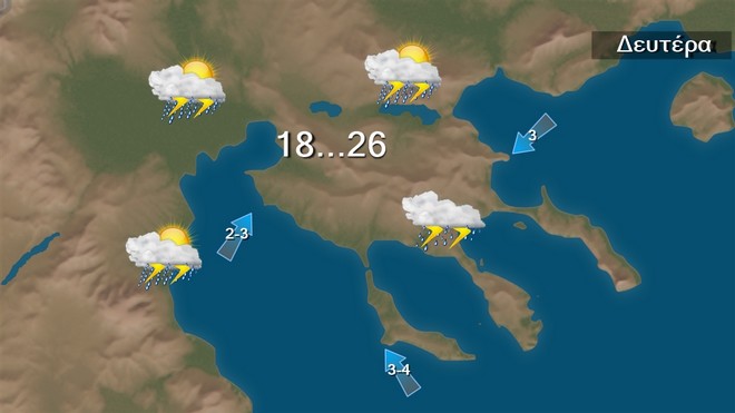 Ύφεση των φαινομένων αναμένεται τις βραδινές ώρες. Οι άνεμοι θα πνέουν μεταβλητοί 3 με 4 μποφόρ και η θερμοκρασία θα κυμανθεί από 18 έως 26 βαθμούς Κελσίου.